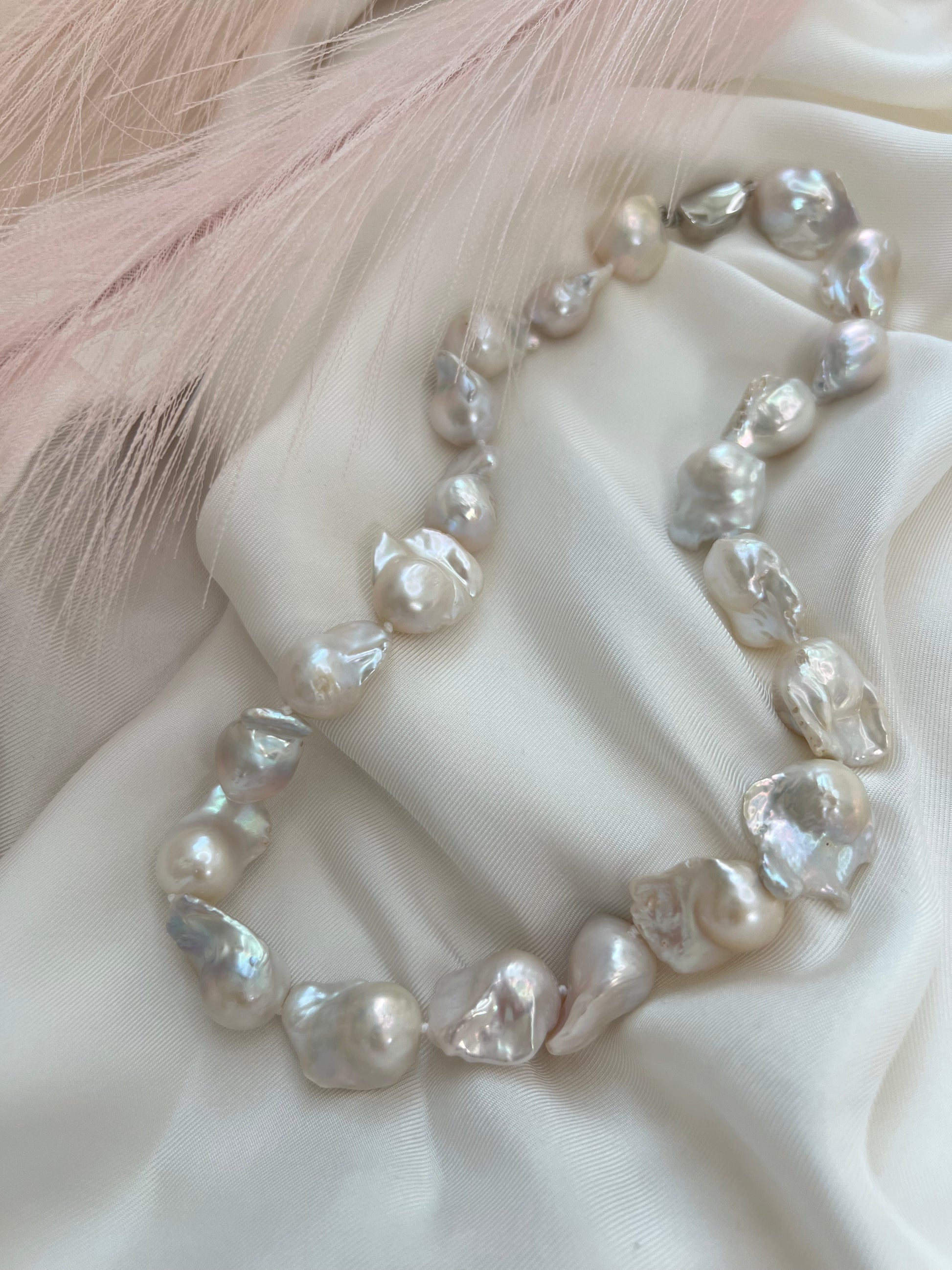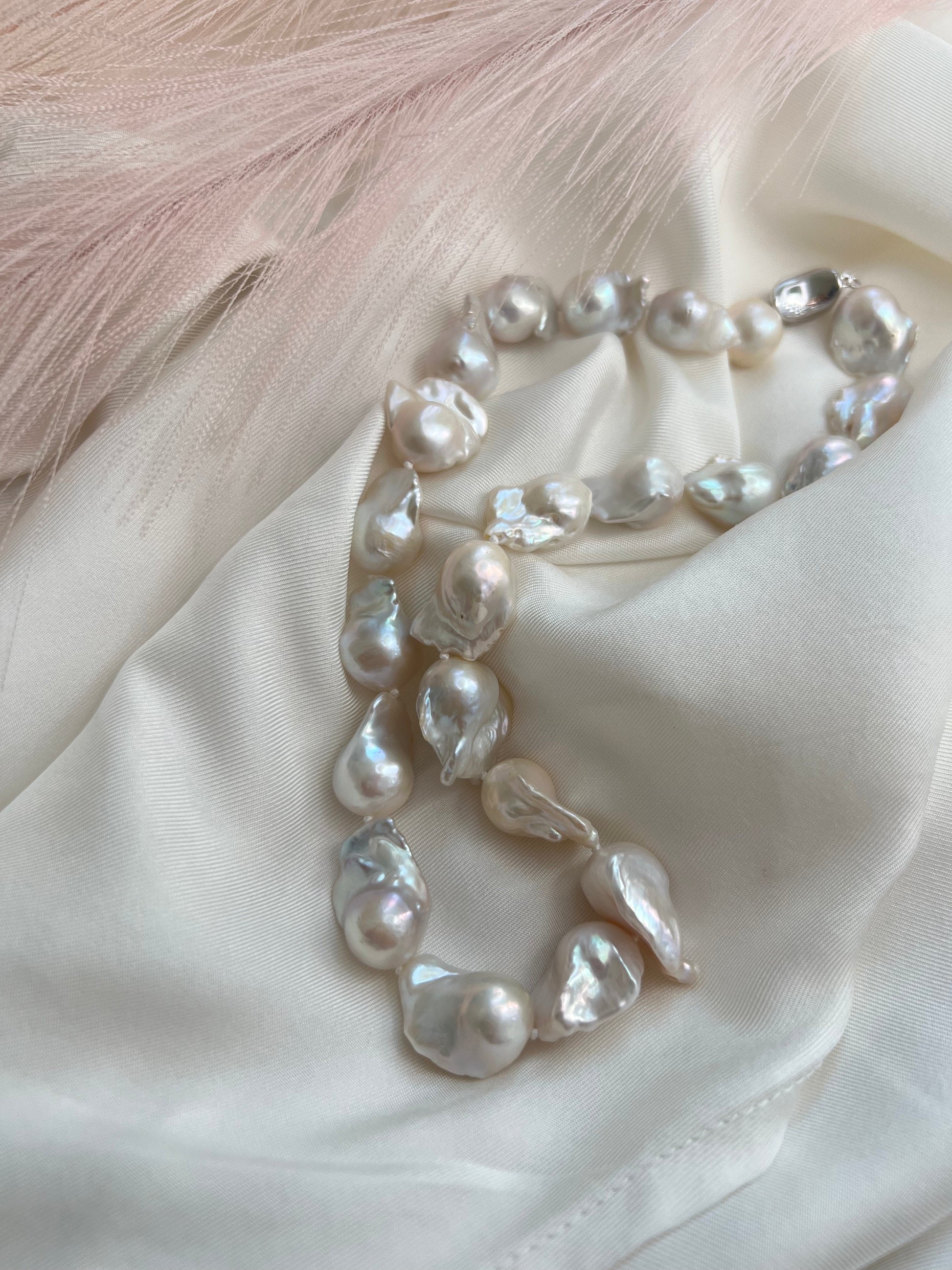 Tämä ainutlaatuinen kaulakoru on valmistettu suurikokoisista barokkihelmistä, jotka hurmaavat luonnollisella, epäsäännöllisellä muodollaan. Jokainen helmi on yksilöllinen taideteos, joka hehkuu kauniisti ja korostaa helmen luonnollista luonnetta.