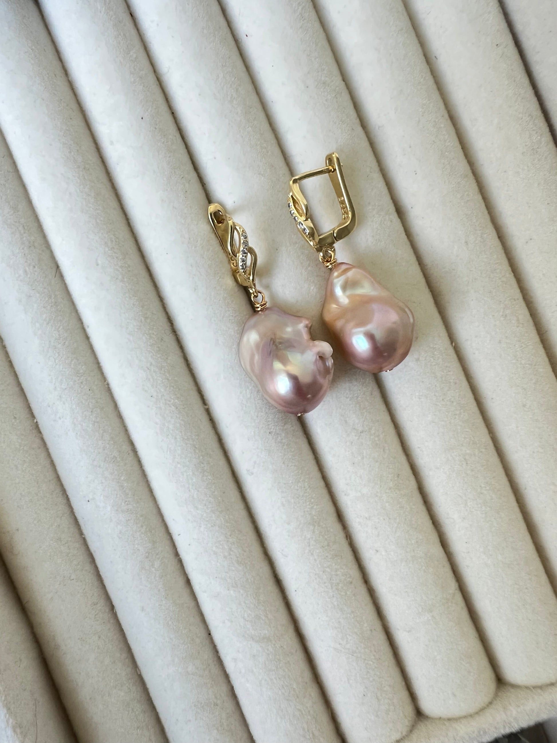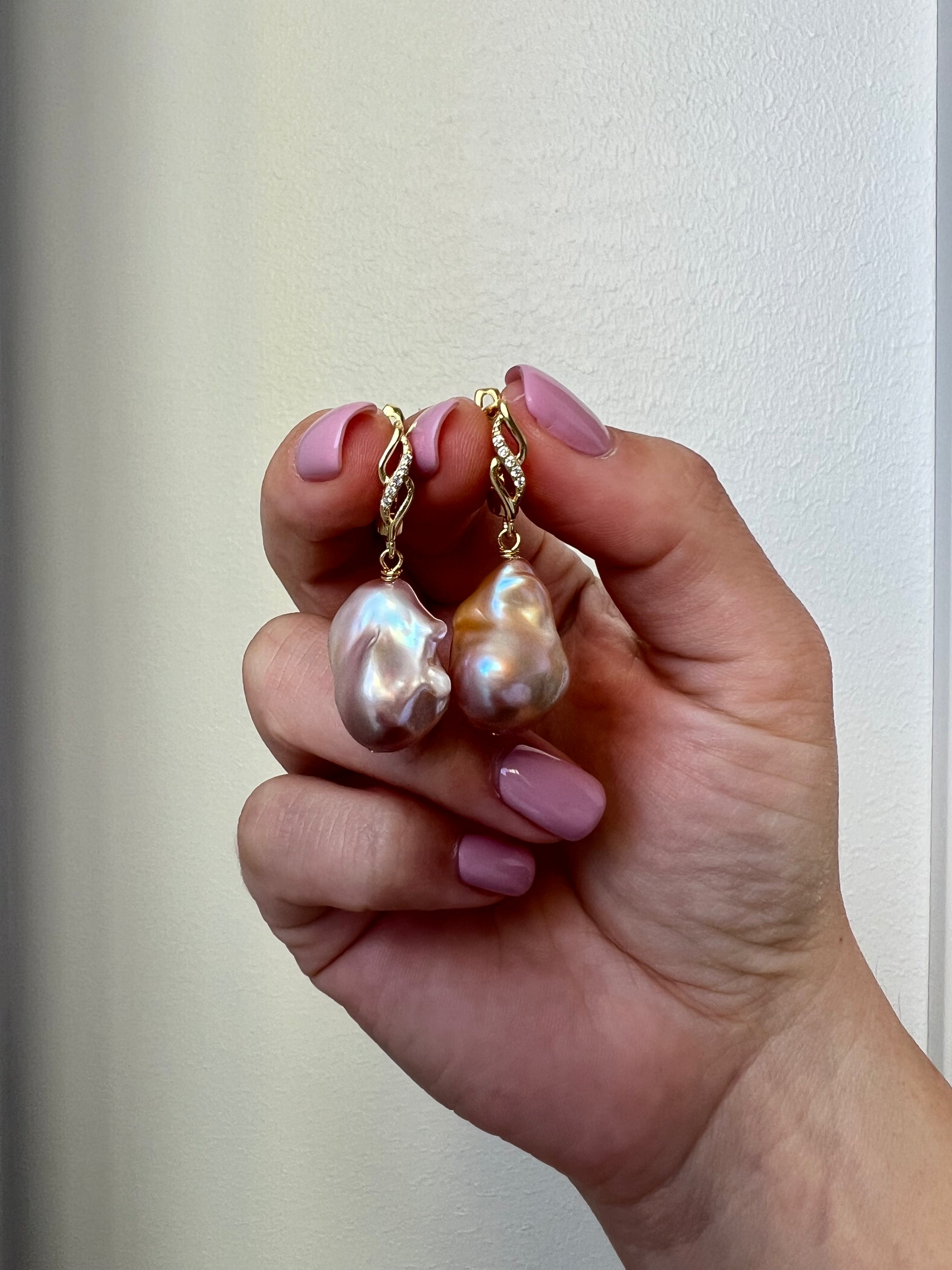 Nämä ainutlaatuiset korvakorut on valmistettu suurista barokkihelmistä, joiden harvinainen sävy huokuu hienostuneisuutta. Jokainen helmi on luonnon mestariteos, ja niiden epäsäännöllinen muoto tekee korvakoruista yhtä aikaa elegantit ja rohkeat.