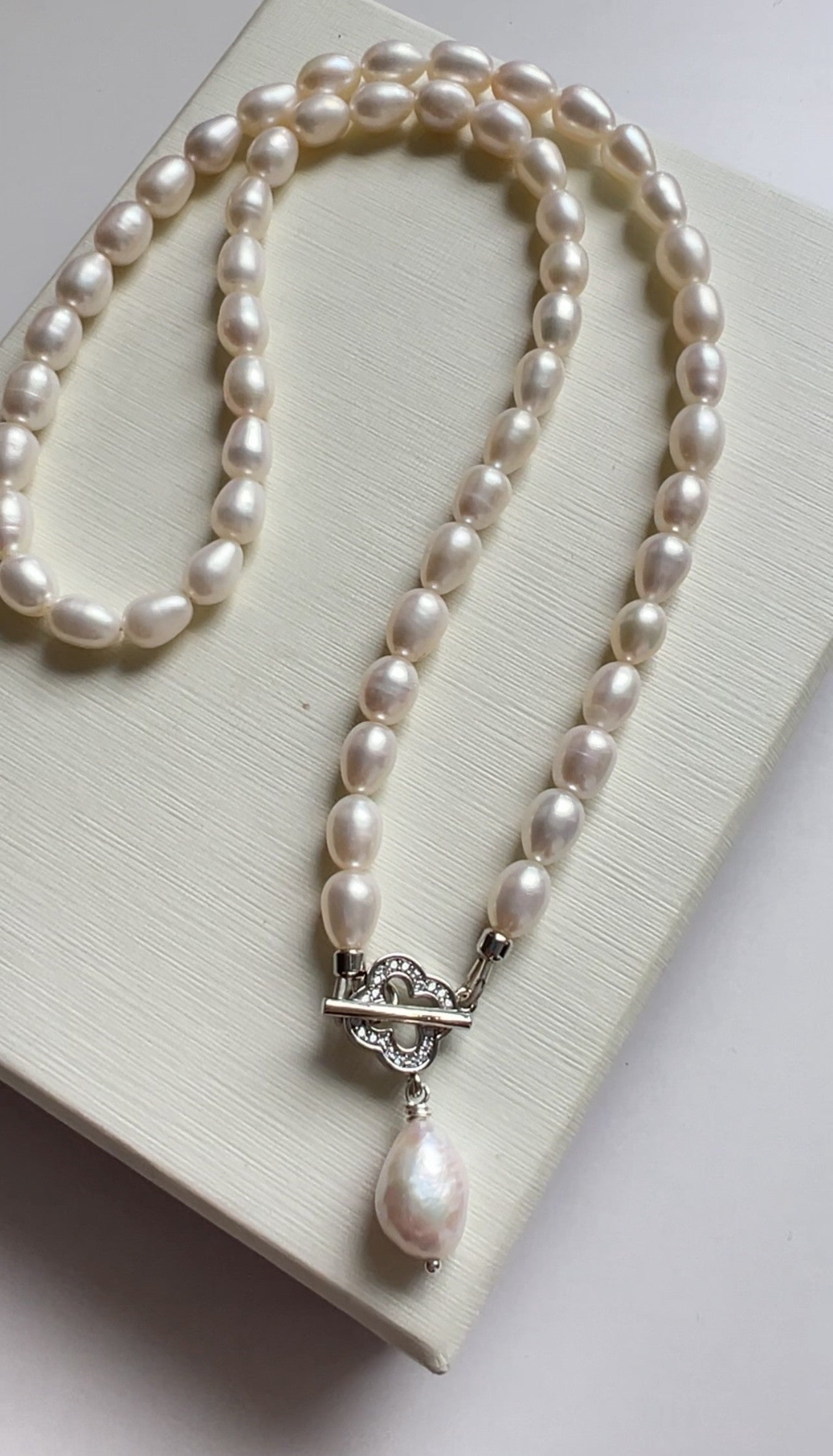 - Materiaali: Makeanveden helmi, cubic zirkonia, rhodium-pinnoitettu messinki