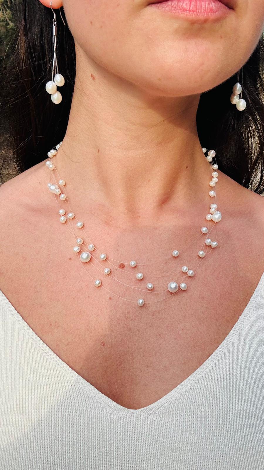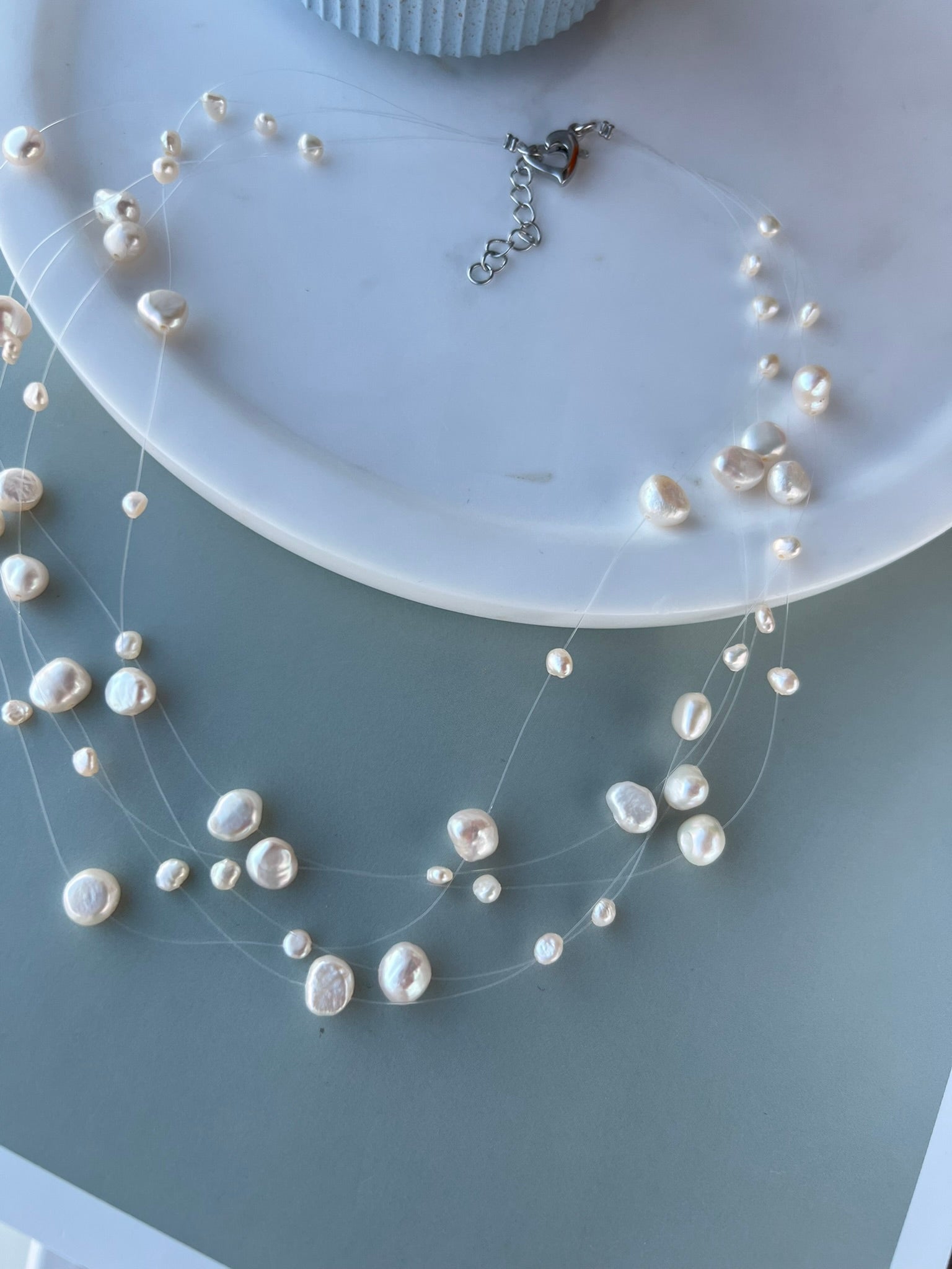 Herkkä ja ilmava kelluva helmikaulakoru, jossa aidot makeanveden helmet näyttävät leijuvan kauniisti iholla. Käsintehty koru, joka tuo asuusi keveyttä, eleganssia ja luonnollista hohdetta — täydellinen arkeen ja juhlaan