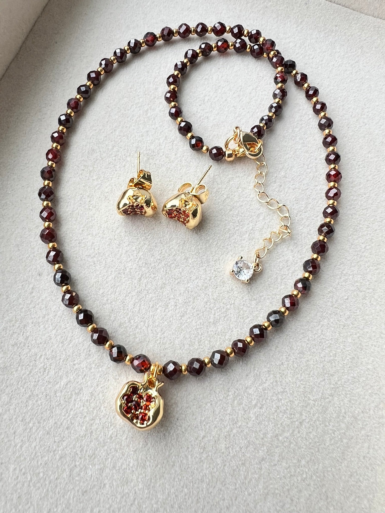 Tämä käsintehty korusetti yhdistää syvänpunaiset zirkoniatit ja 18K kullatun messingin elegantiksi kokonaisuudeksi.