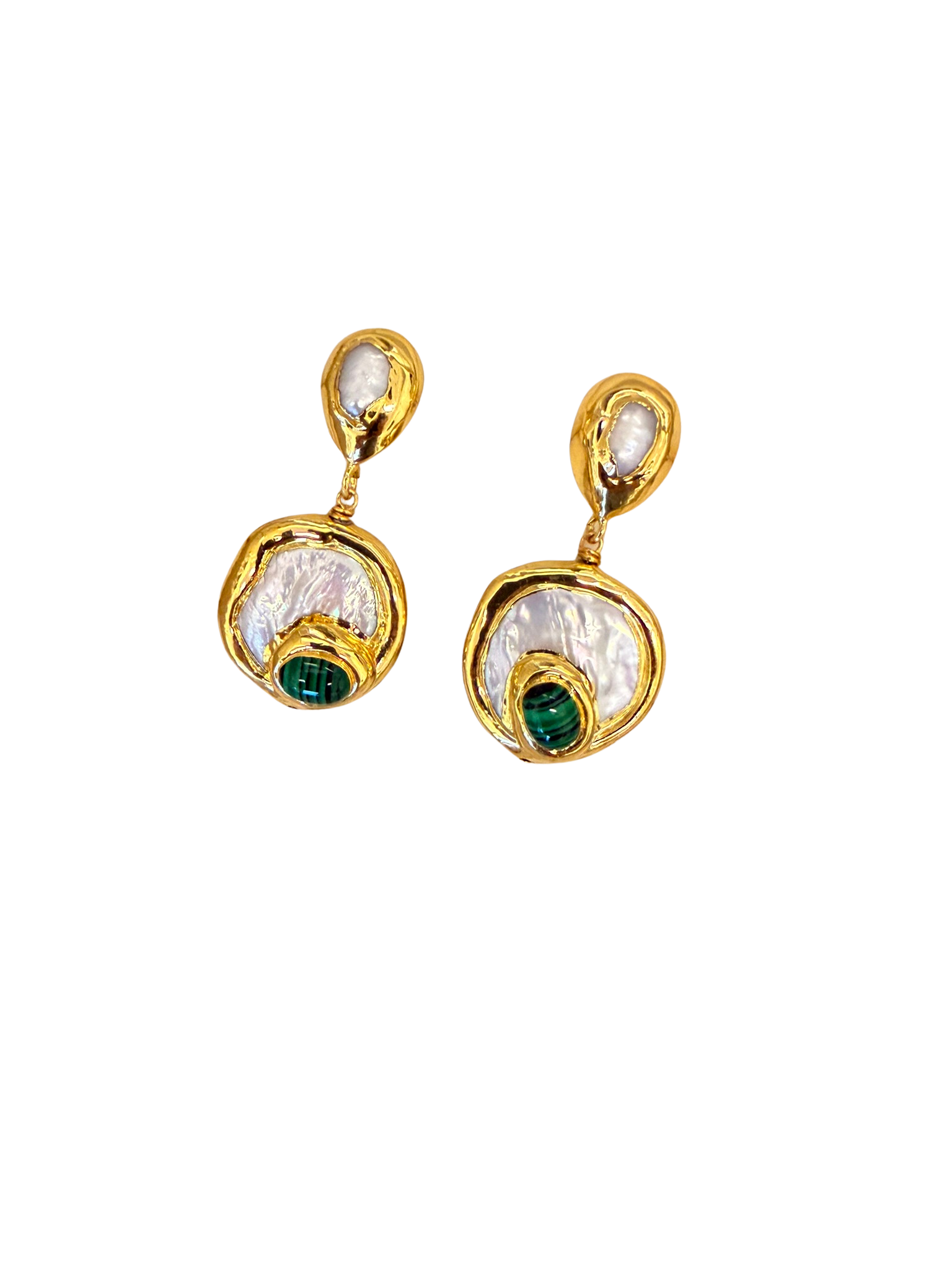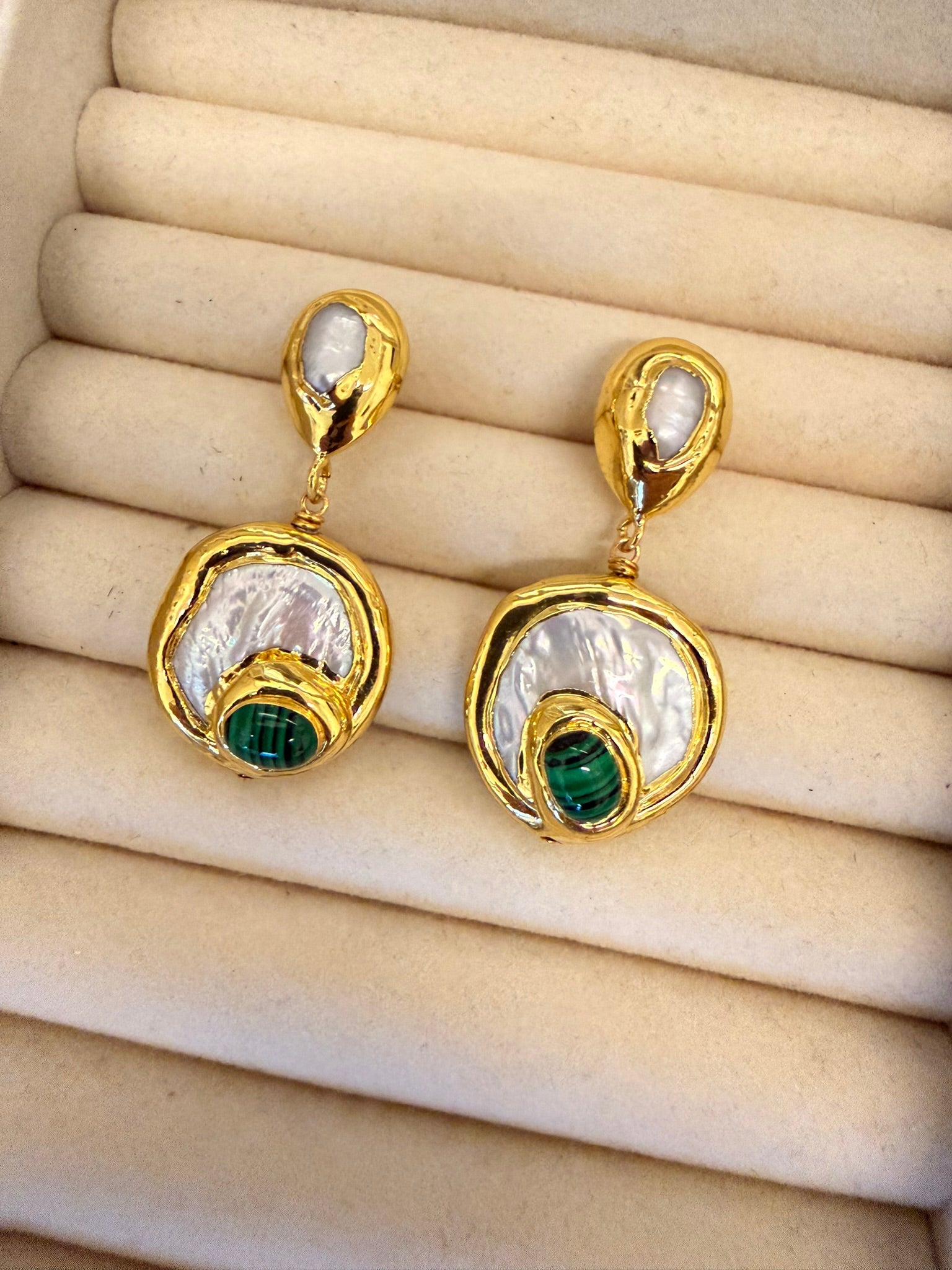 Upeat käsintehdyt korvakorut, joissa luonnonhelmen pehmeä hohde yhdistyy malakiittia muistuttavaan vihreään yksityiskohtaan.