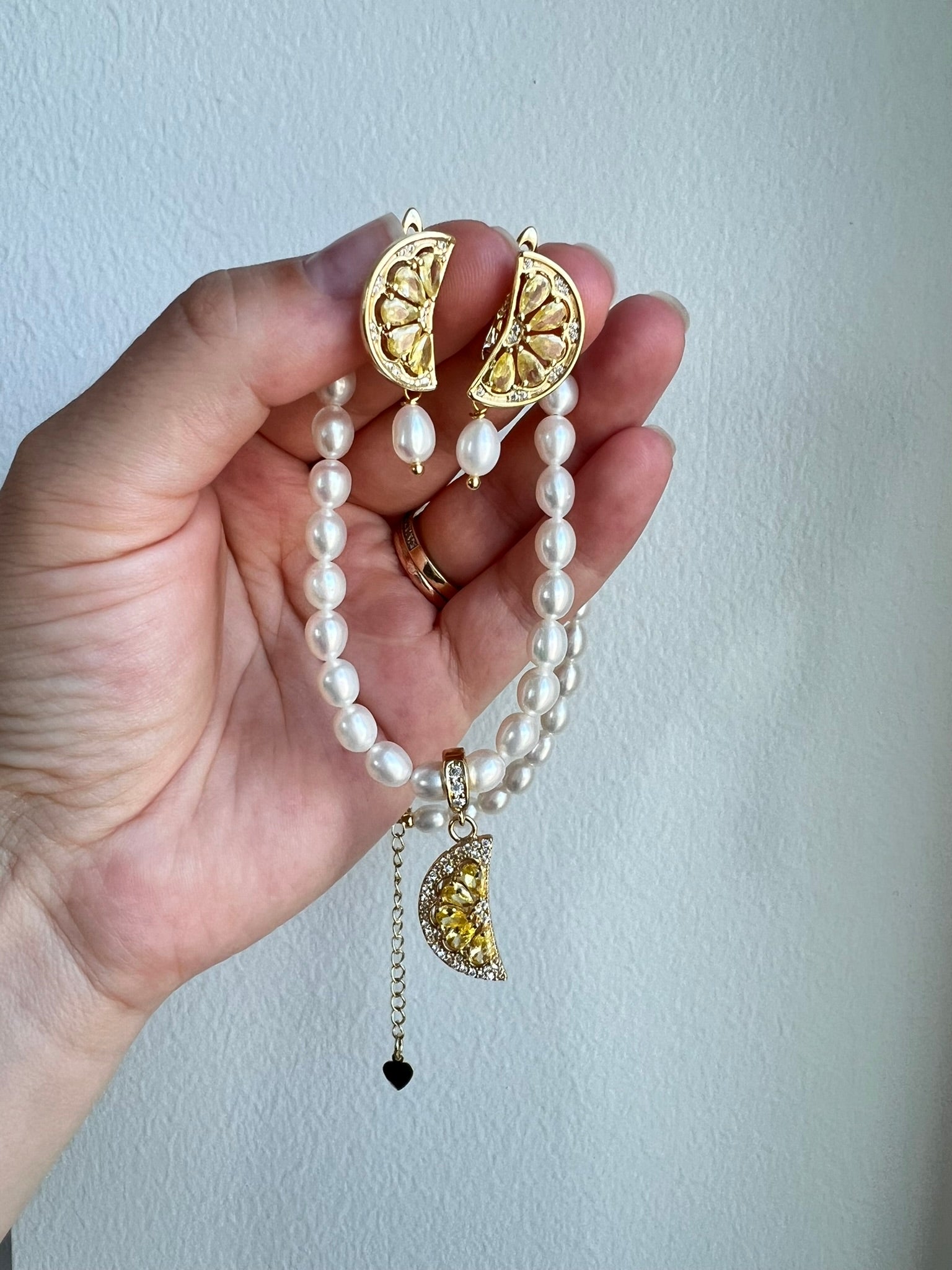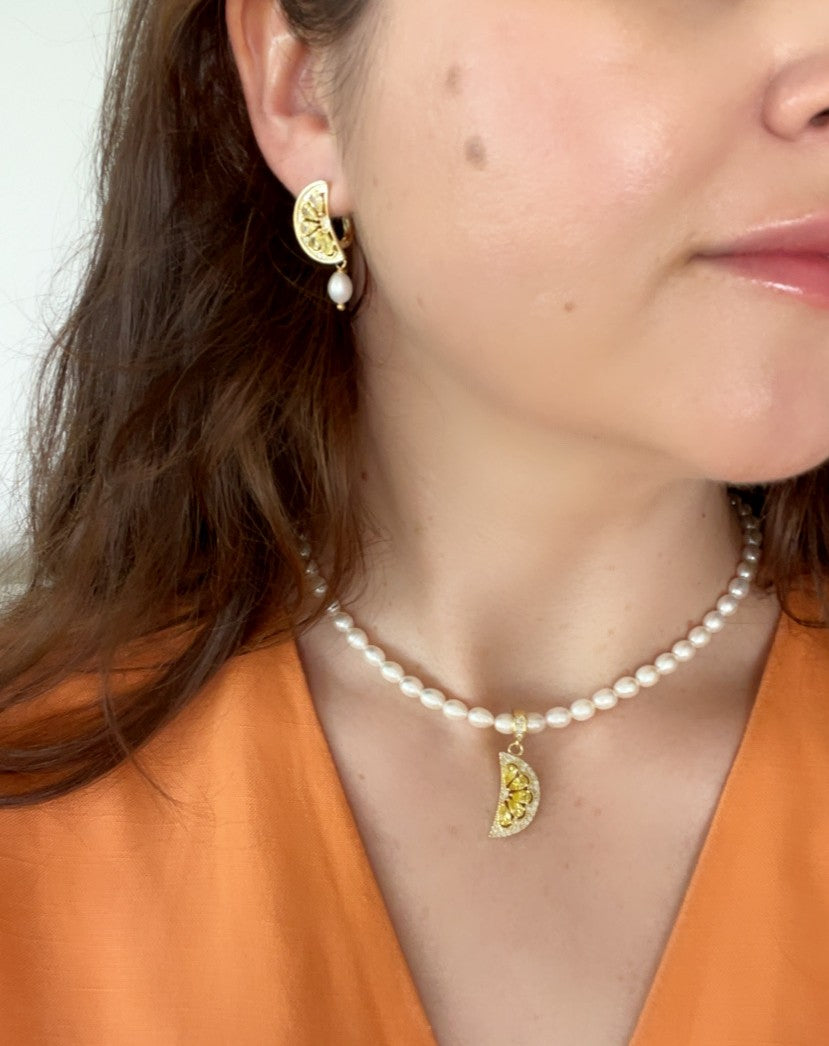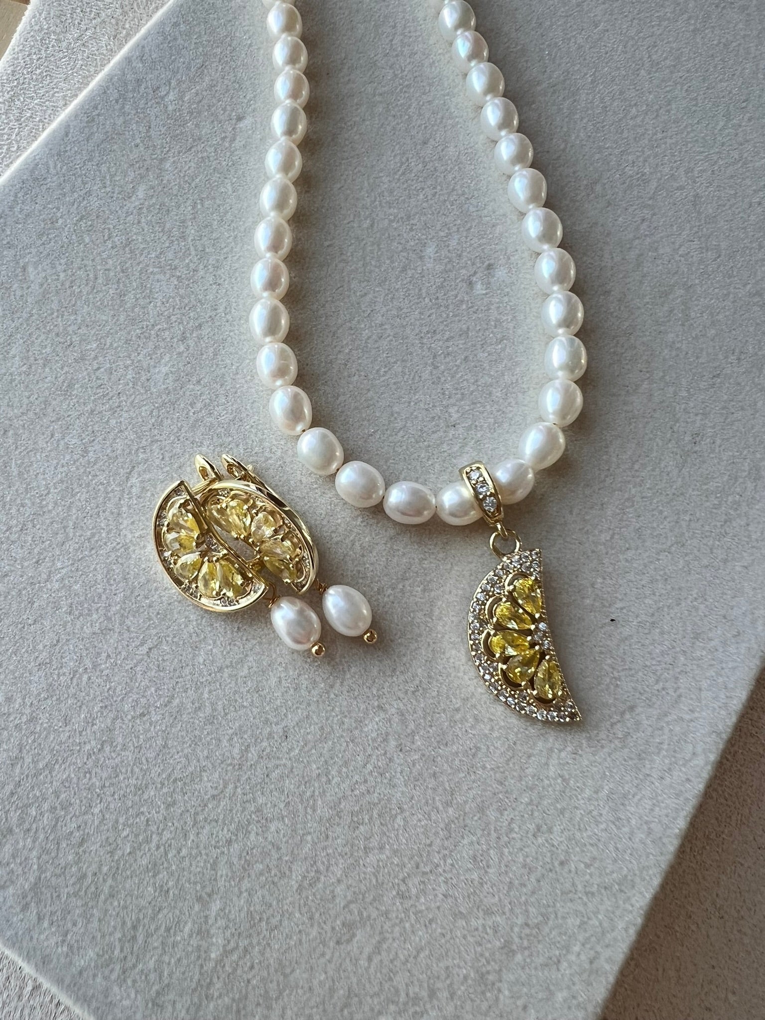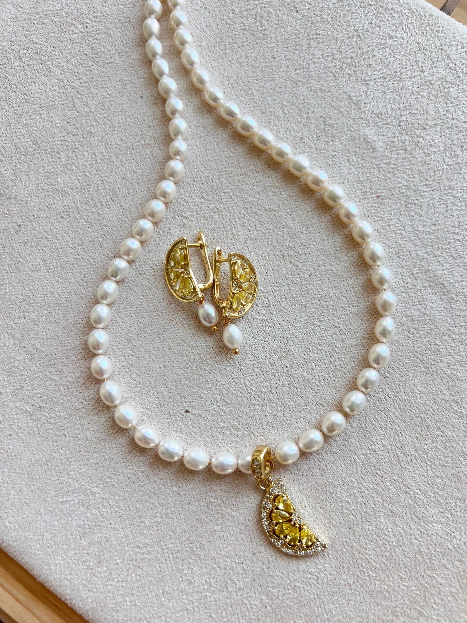 Settiin kuuluu makeanveden helmikaulakoru, irrotettava sitruuna-riipus sekä siihen täydellisesti sopivat 18K kullatut S925-korvakorut.
