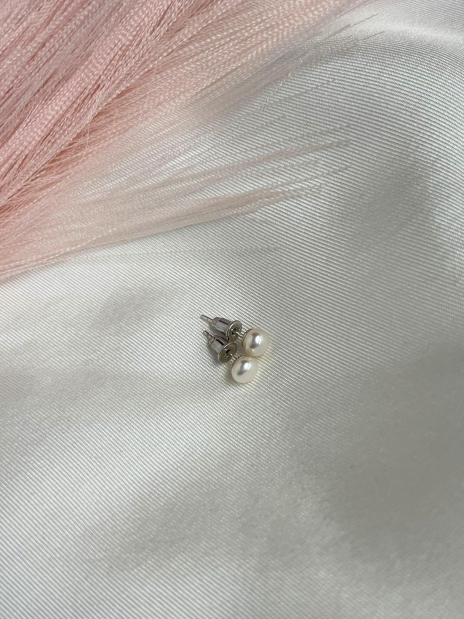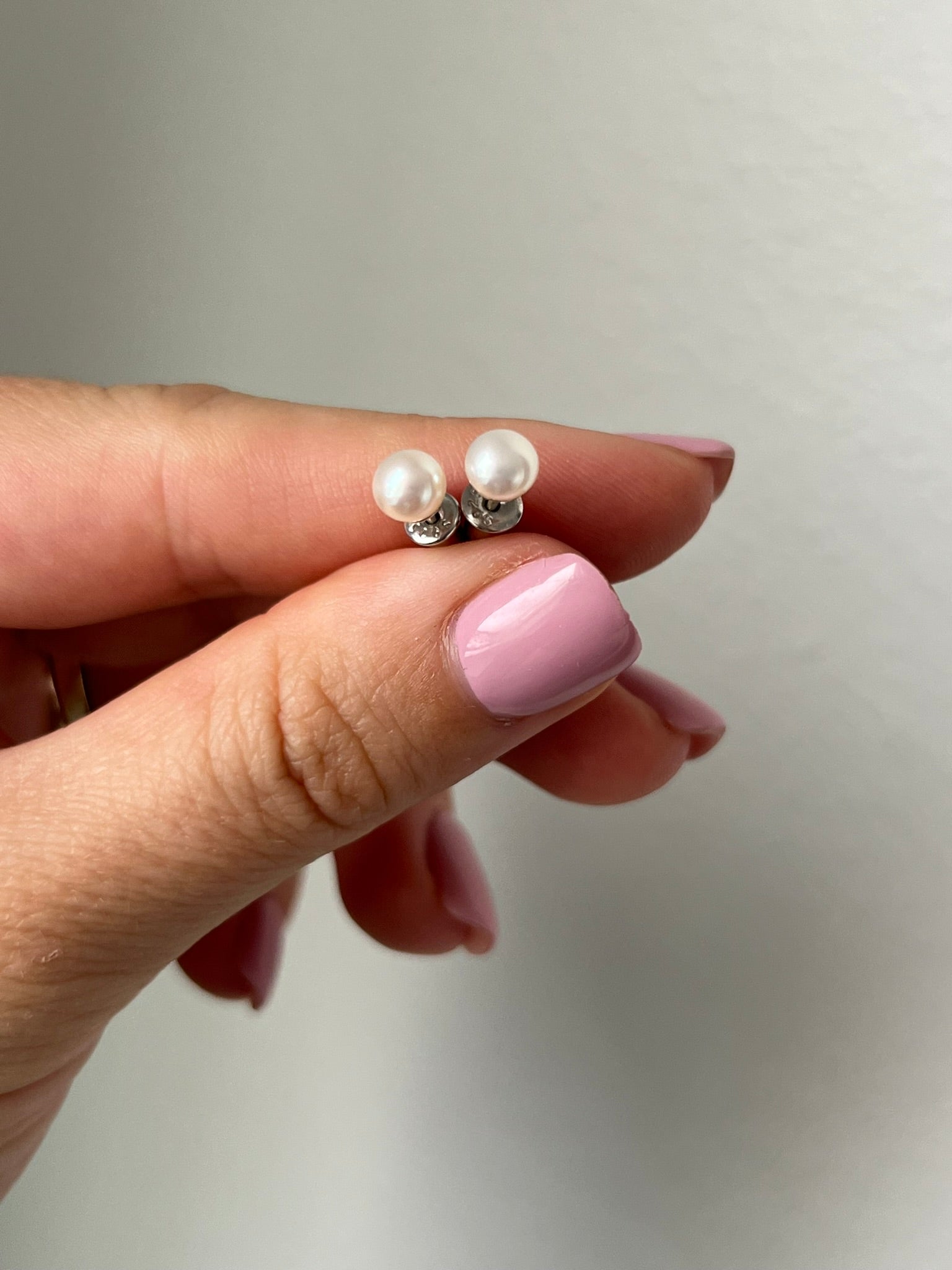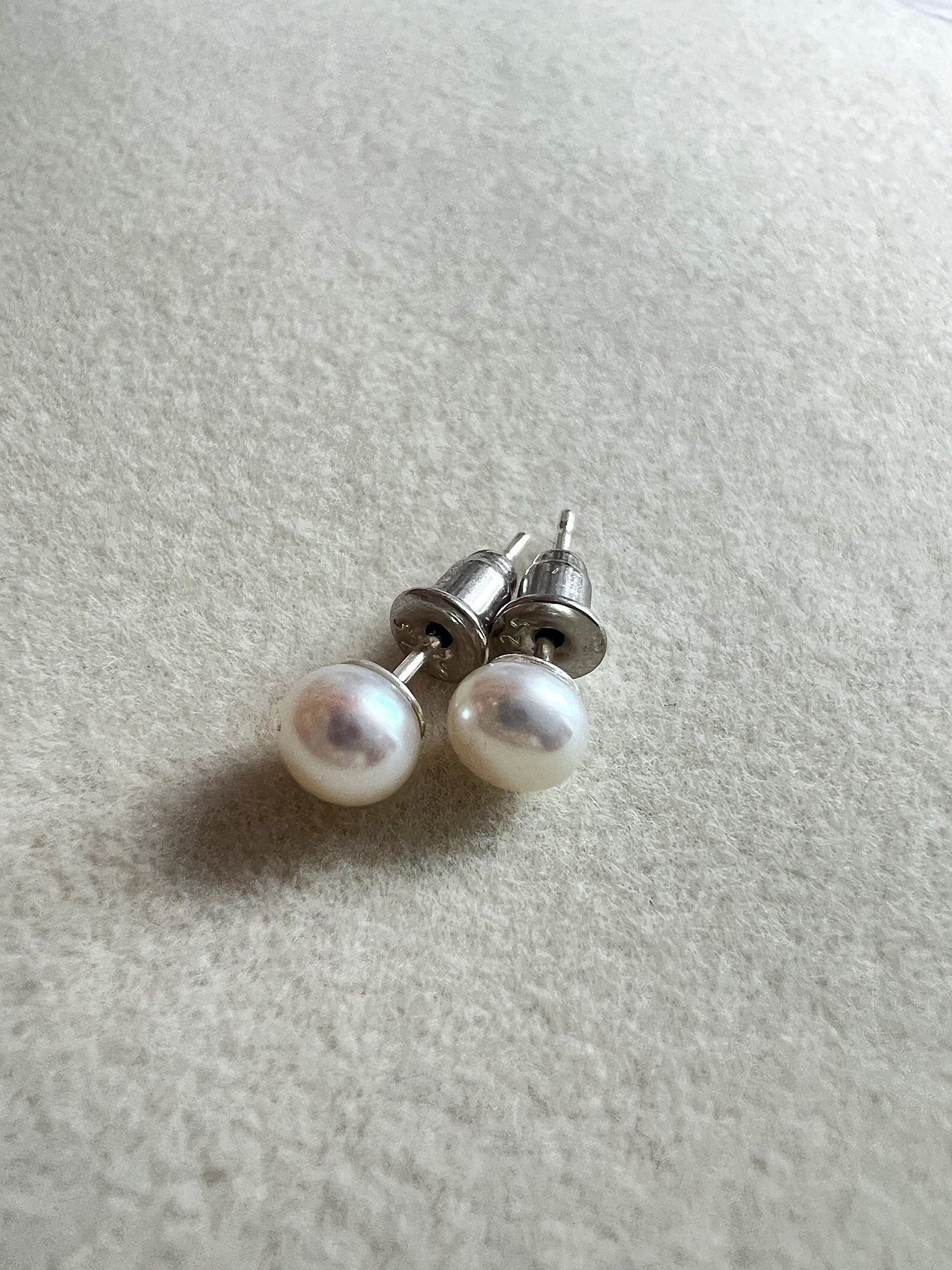 Klassiset nappikorvakorut valkoisilla 6 mm makeanvedenhelmillä. Korvakorujen runko on sterling-hopeaa.