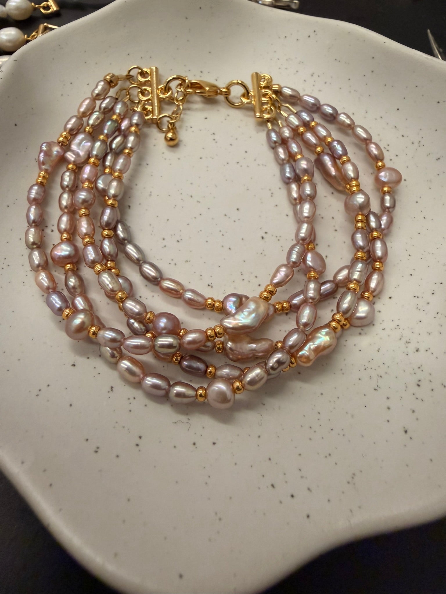 Upea käsintehty rannekoru viidestä säikeestä aitoa purppuran sävyistä helmeä. Helmien kaunis hohde ja monirivinen muotoilu luovat ylellisen mutta naisellisen kokonaisuuden. Säädettävä pituus tekee rannekorusta mukavan käyttää ja sopivan eri ranteisiin.