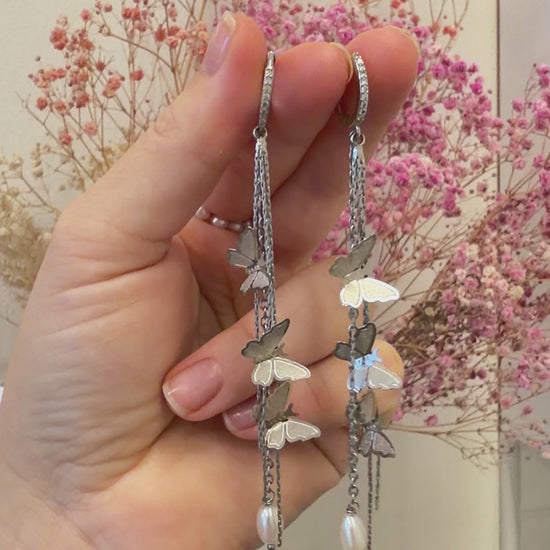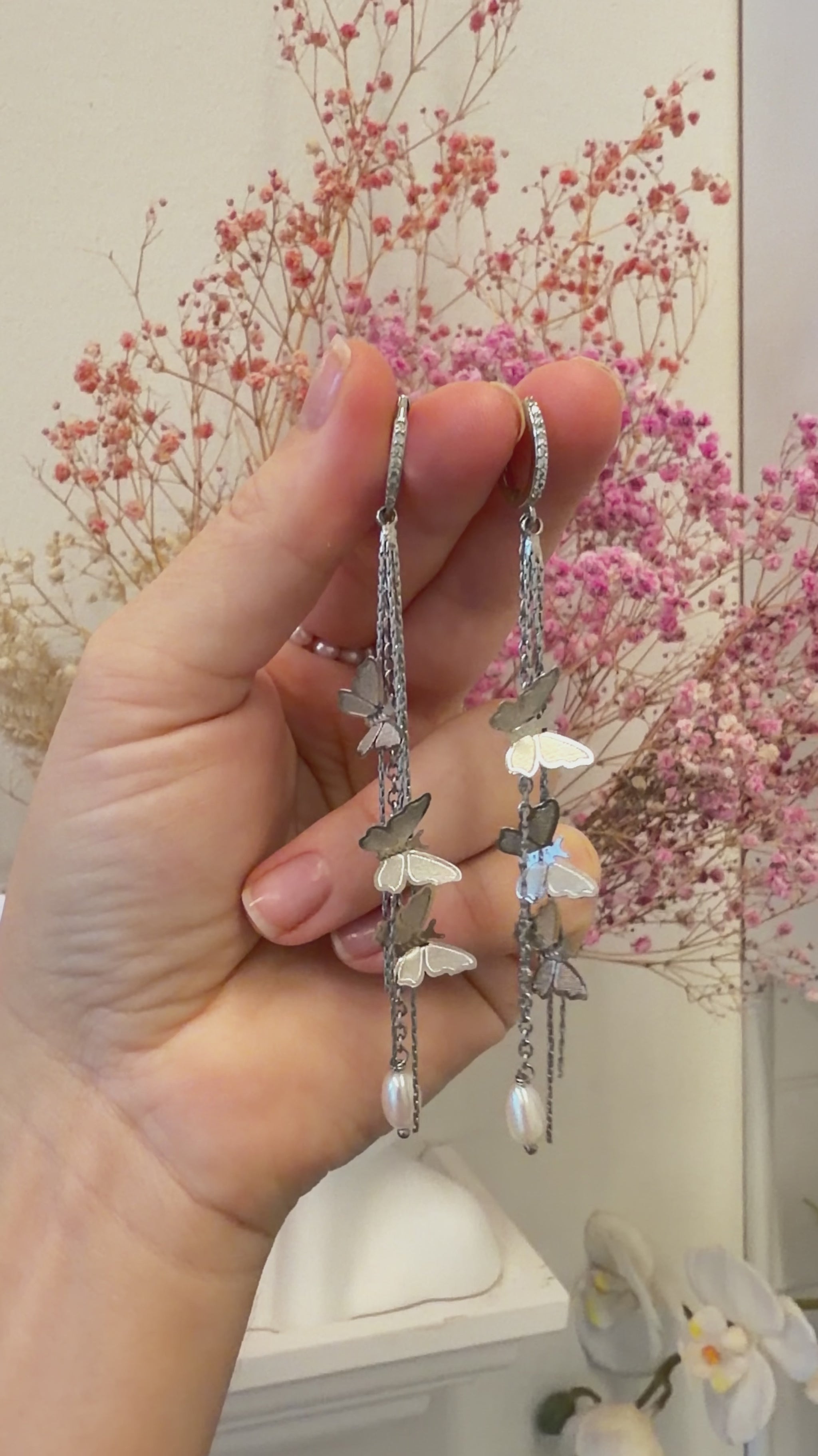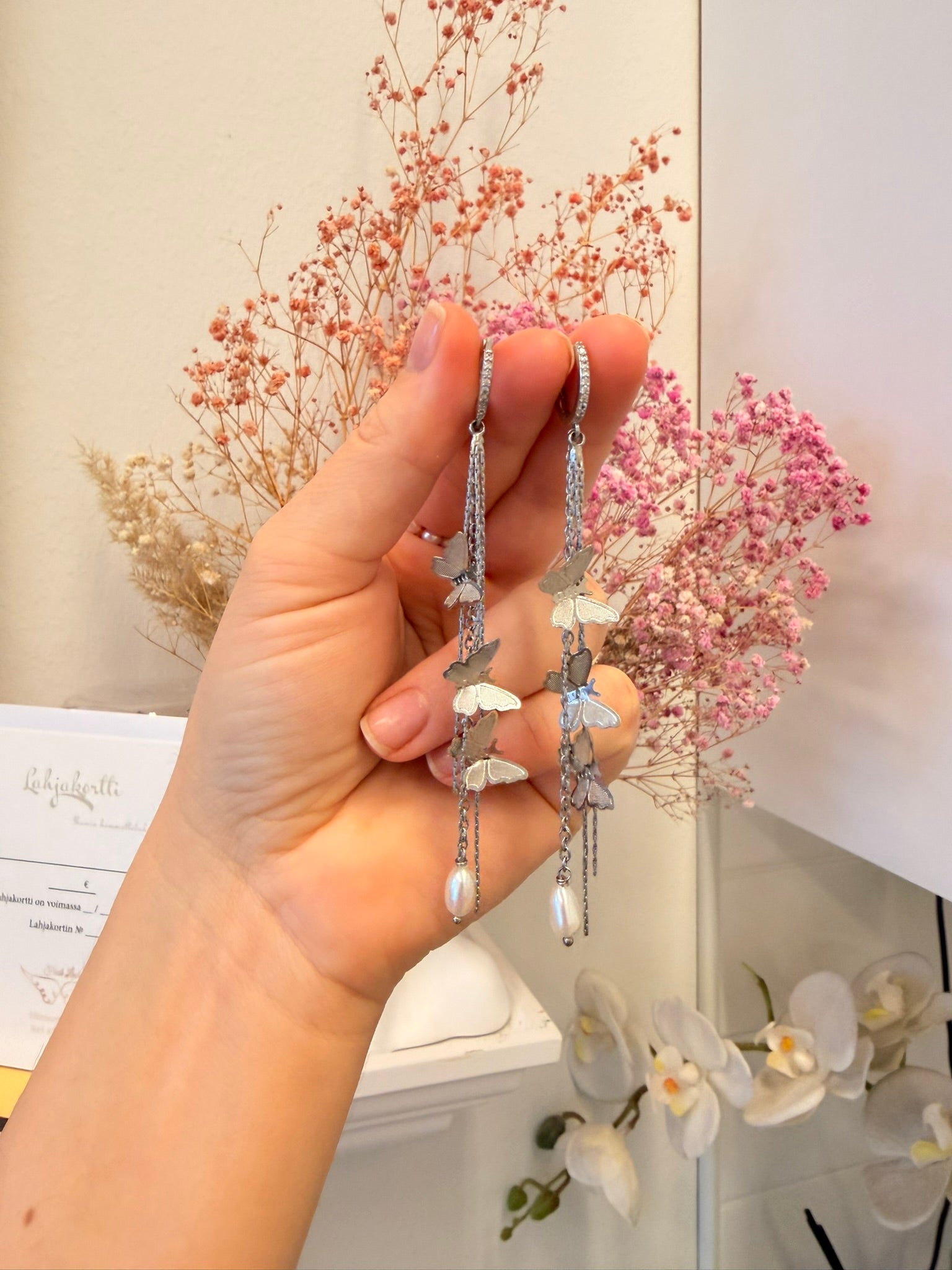 Upeat käsintehdyt korvakorut, joissa herkkä perhosdesign yhdistyy hohtaviin zirkon-kiviin ja luonnon helmiin. Rodium-pinnoitettu messinki takaa kauniin, kestävän kiillon.