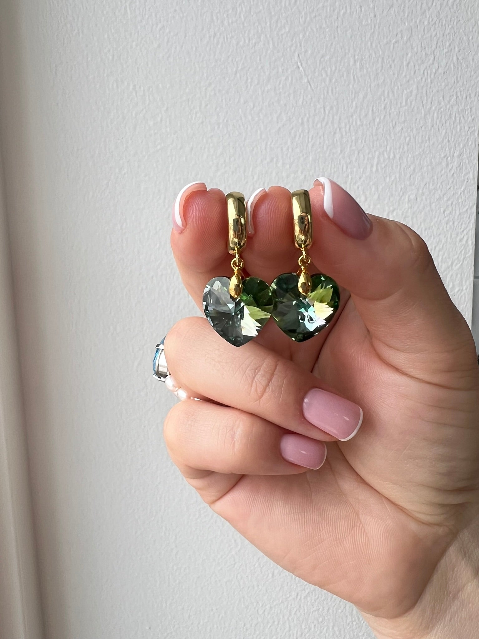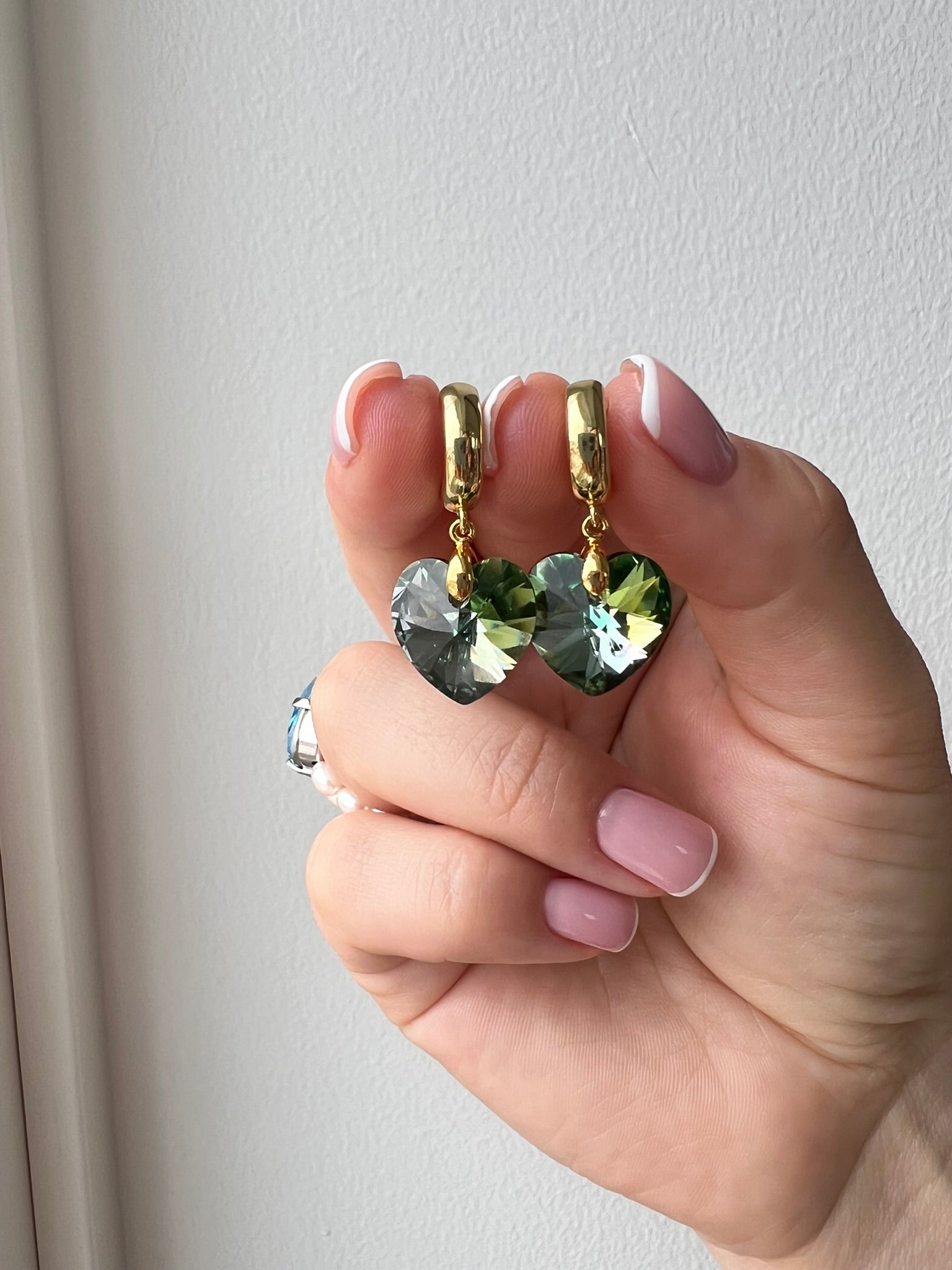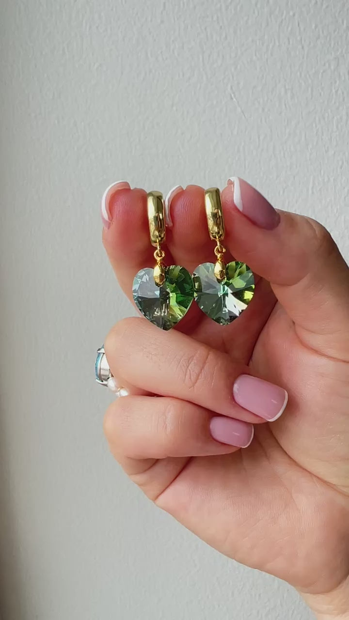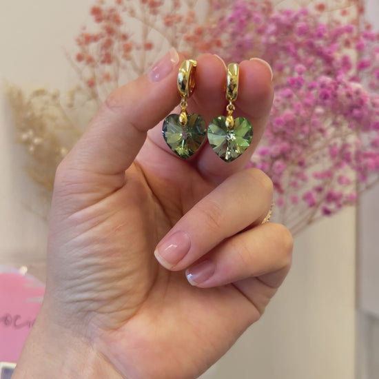 Näyttävät sydämenmuotoiset Swarovski-kristallit säihkyvät raikkaassa peridotin vihreässä sävyssä. Korvakorujen pohja on valmistettu messingistä ja viimeistelty ylellisellä 18 karaatin kultauksella.